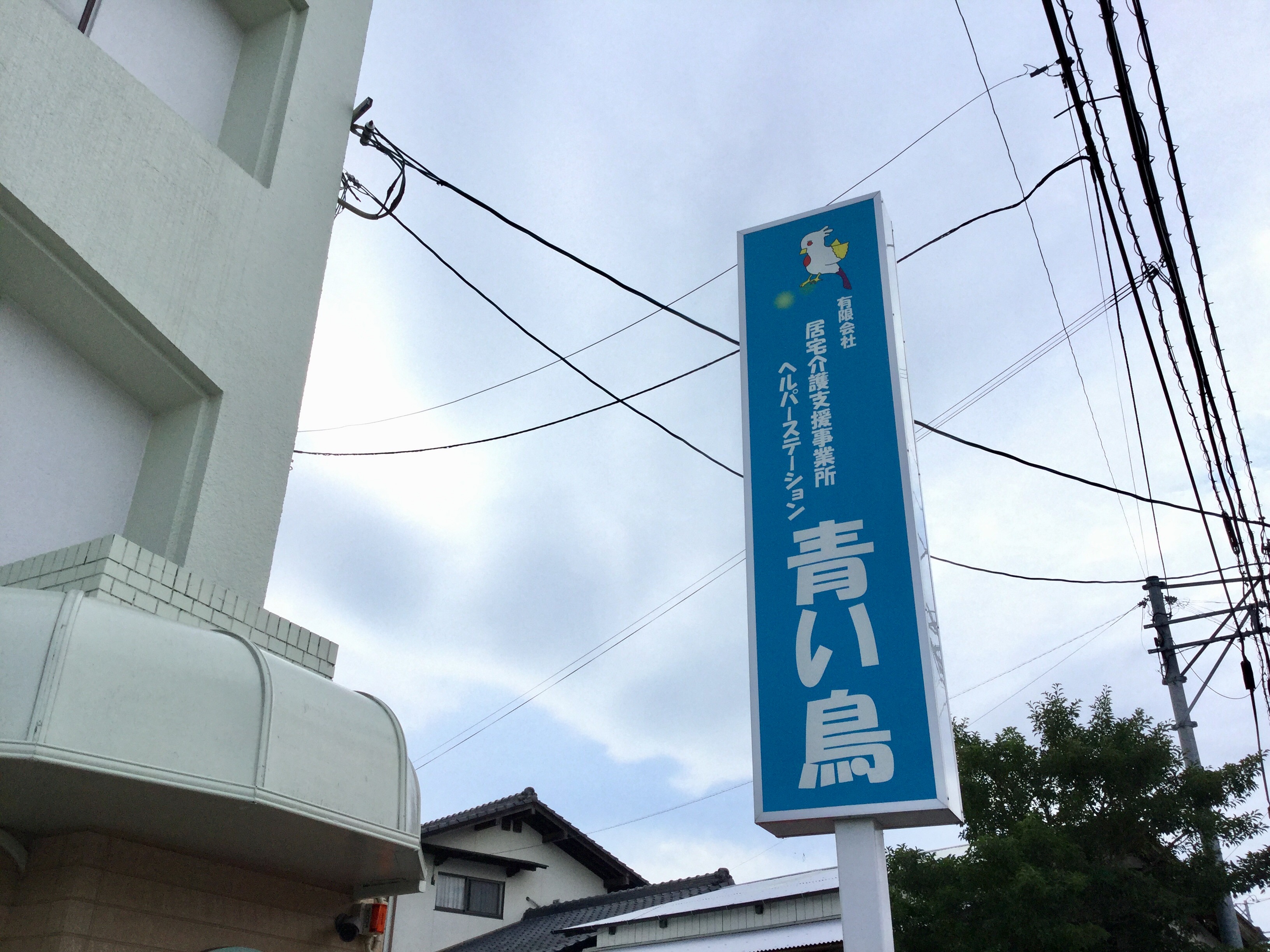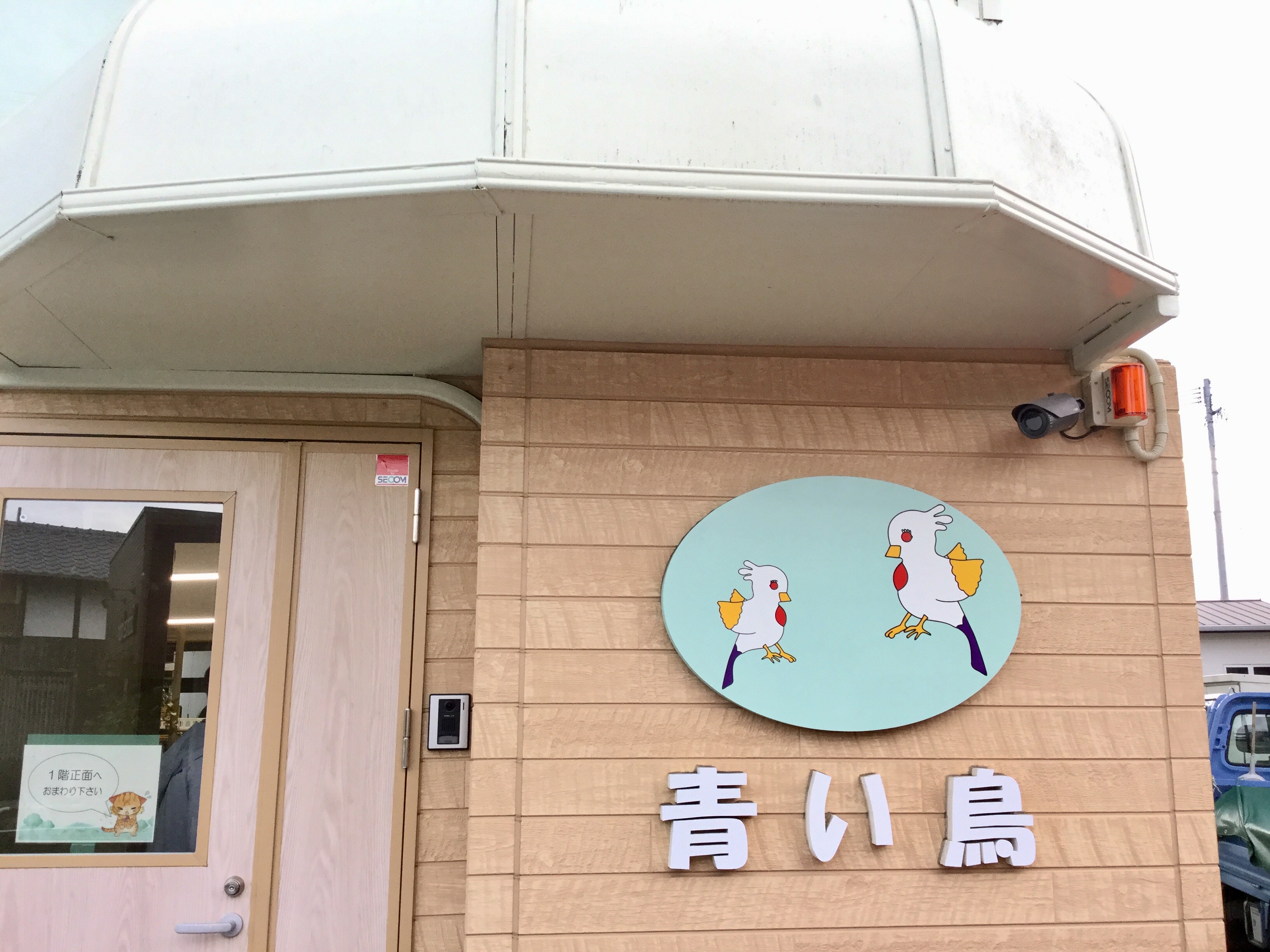 鳥と青色の看板がかわいらしい入り口です。