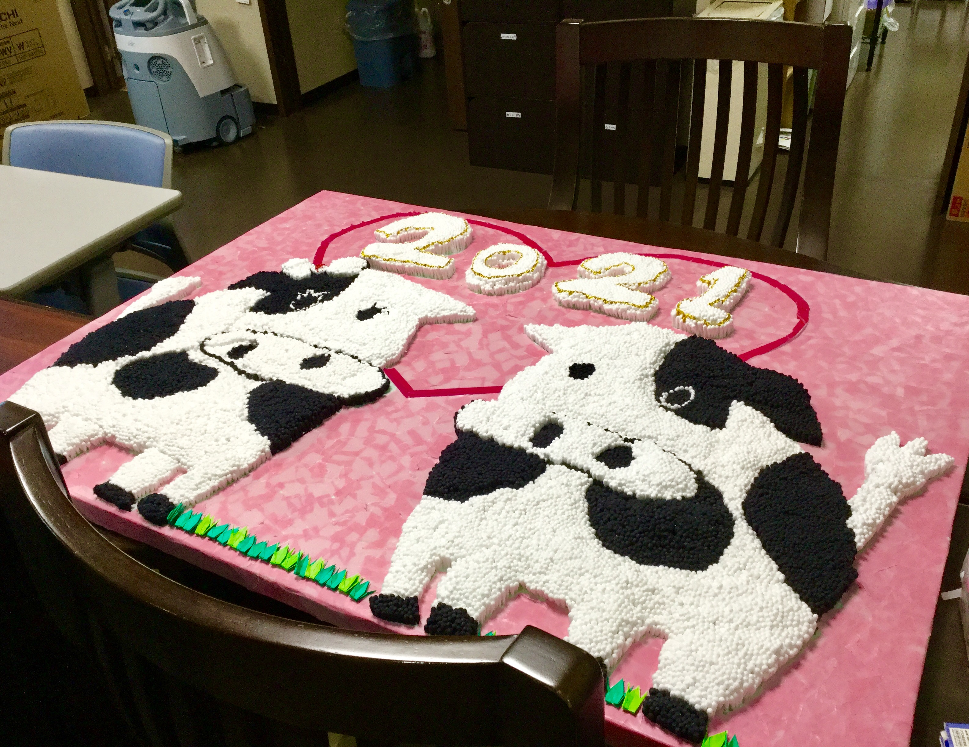 最後の写真は来年の干支の丑さんを、入居者様で作られた壁飾りです🐮✨ ほぼ完成! とっても良くできていてびっくりしました❣️ ちなみに今年は子年でしたので、ミッキーマウスの壁飾りがかけてありましたよ🐭✨