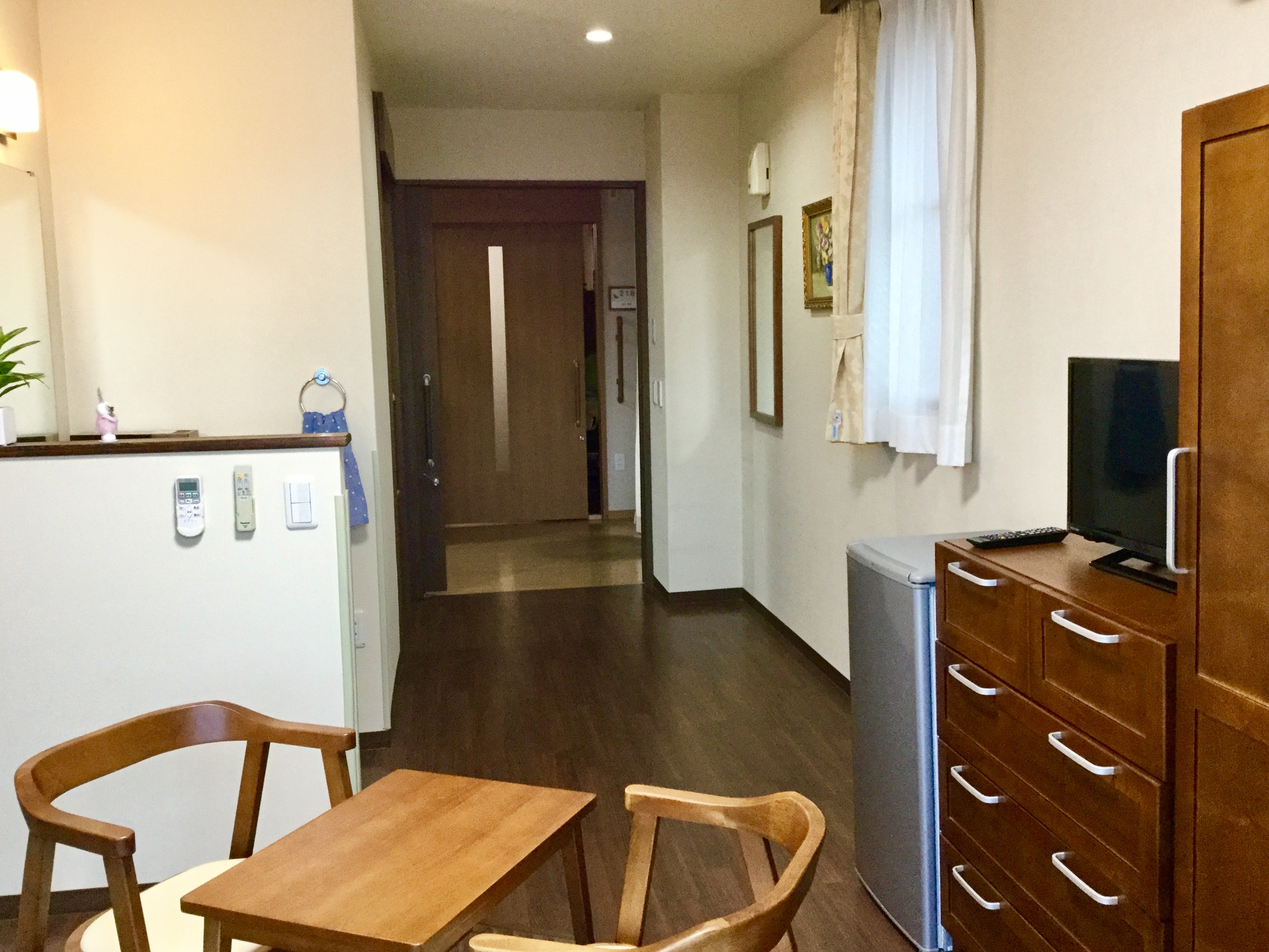 48室の居室は全室家具、カーテン、家電付きとなります。テーブルと椅子まで付いているのは、嬉しいですよね!トイレも各部屋に付いてます。