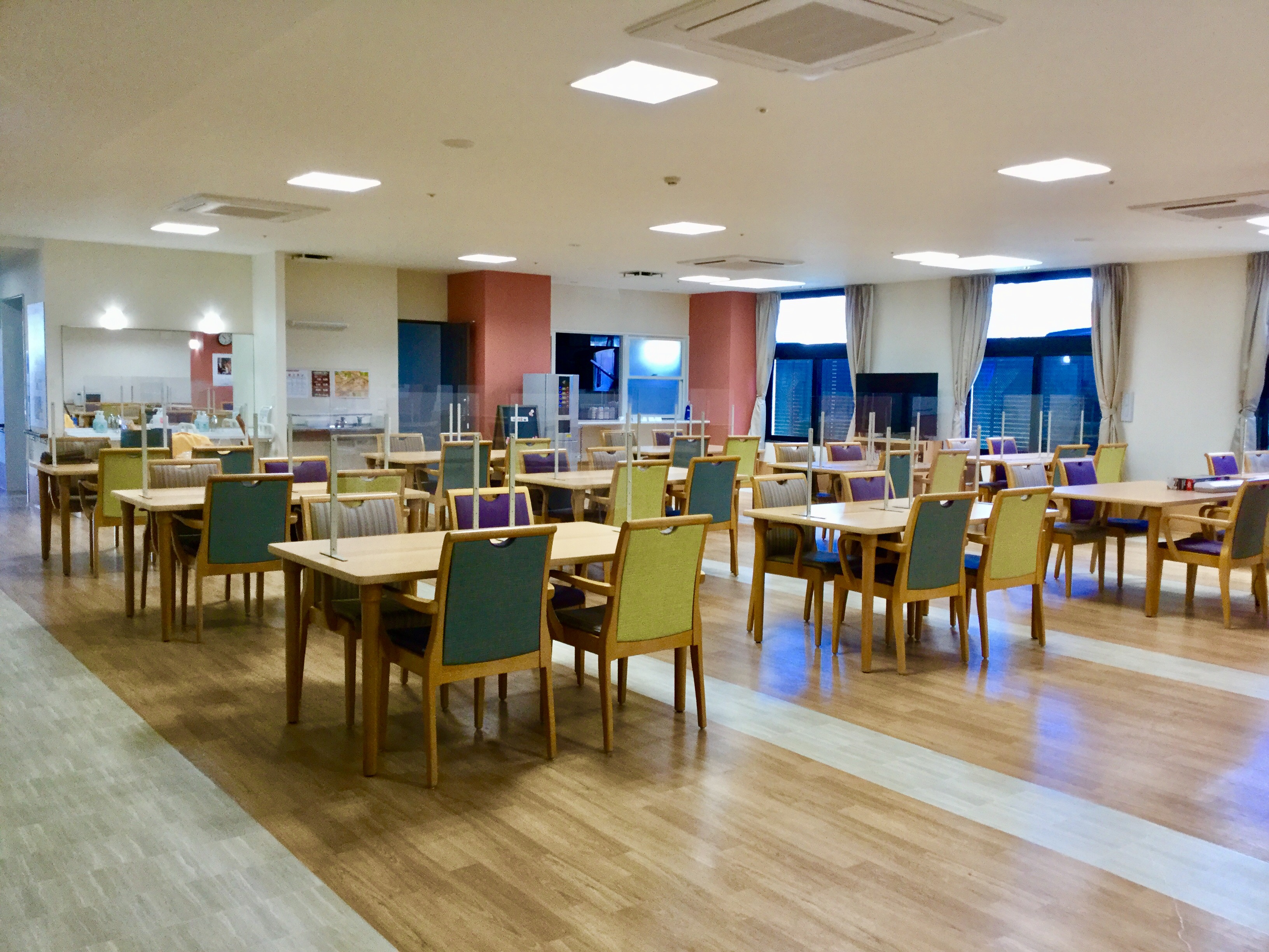 館内はとても明るく広々としており、落ち着いた心地よい空間が楽しめますよ🍀食堂はコロナ対策で、各テーブルはパーテーションで区切られてます!